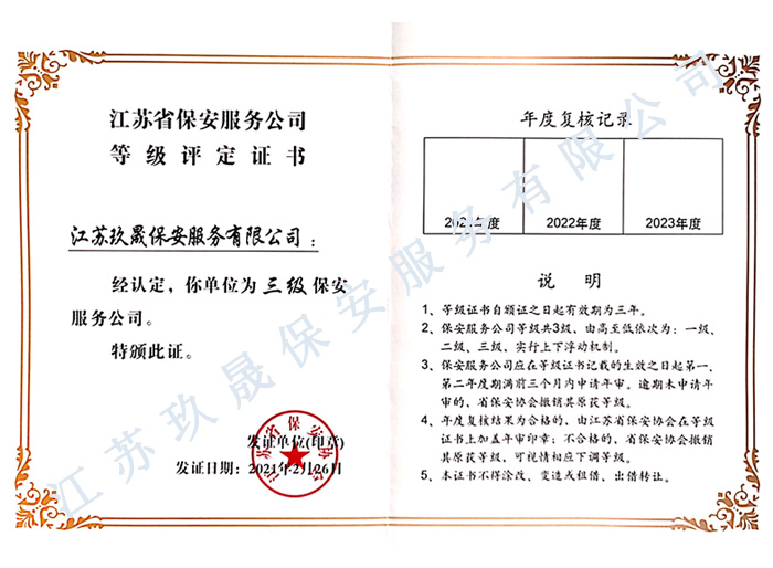 江蘇玖晟保安服務(wù)有限公司成立于江蘇省昆山市千燈鎮(zhèn)。注冊資金:5000萬,是擁有省公安廳頒發(fā)的保安服務(wù)許可證的企業(yè)【蘇公保服20170046】,也是昆山市保安協(xié)會常務(wù)理事單位。